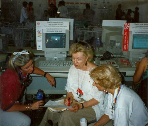You can find the rest of that part of the story at the Beijing+ Balloon. WIN partnered with Apple Computer and linked them with women leaders at the NGO Parallel Forum in China, who were interviewed daily by Sue Haye on a phone from Cupertino, California. Bella Abzug gave interviews at the beginning and end of that Conference. There was no Telepresence then. Apple had 100 computers in Huairou, China and 80 volunteers who connected women for a global cyber women’s movement.