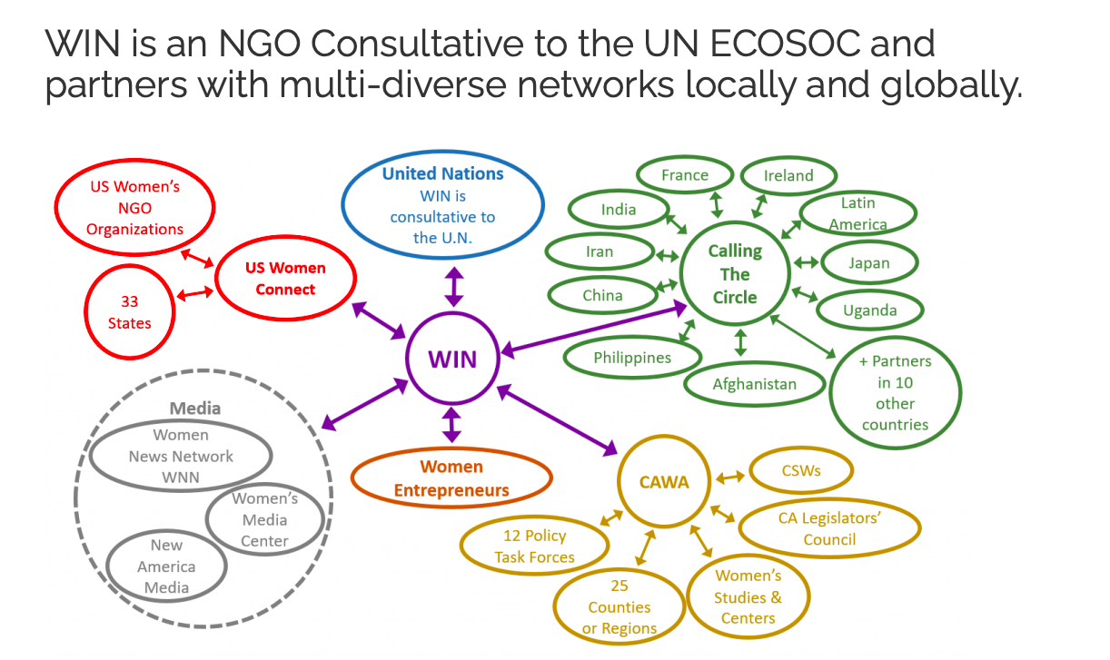 WIN has been connecting women and girls across cultures, globally and in US communities since 1994 for collective action on the ground and on the internet to pursue our Mission. WIN built the first policy mechanism to implement the Beijing Platform for Action from the 4th World Conference on Women, known globally as CAWA- the California Women’s Agenda. WIN has brought delegations to the UN CSW every year!